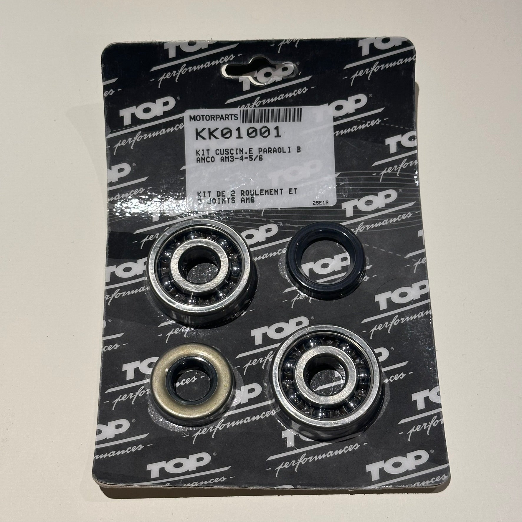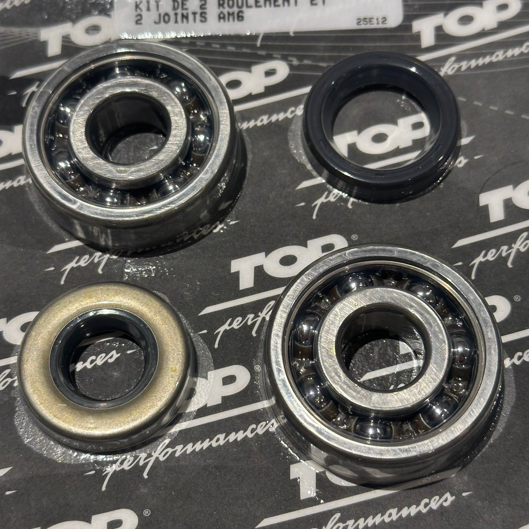 Kvalitets lager från Top Performance som passar AM6 motorn. Ett tips för att installera dessa är att lägga ner dom i frysen över natten. På så vis drar metallen ihop sig. Sedan värm upp motorblocken med gasol brännare eller med värme pistol, på så vis expanderar aluminiumet i blocken. Sedan kommer dessa lager bara "ramla" in i sin plats.