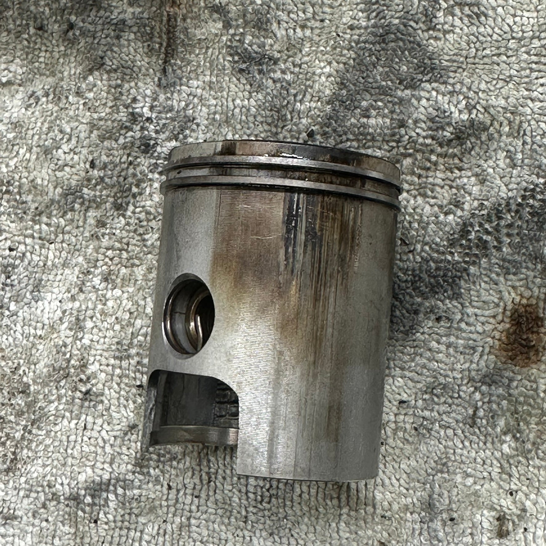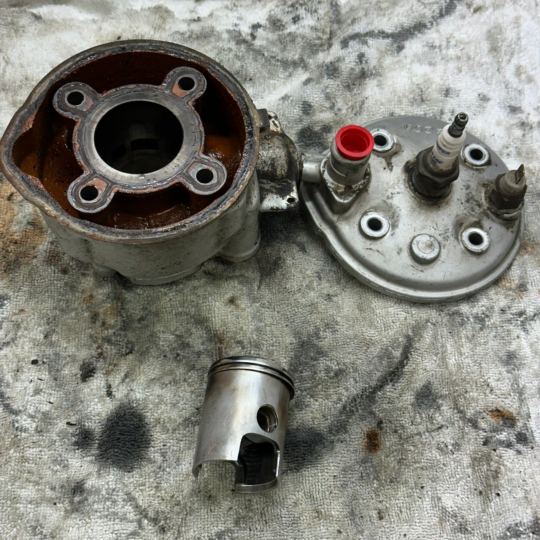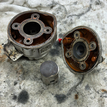 Fin cylinder samt topplock. Kolven har märke som syns på bilderna. Saknar ett kolvklips. Nållager samt kolvbult sitter redan monterat